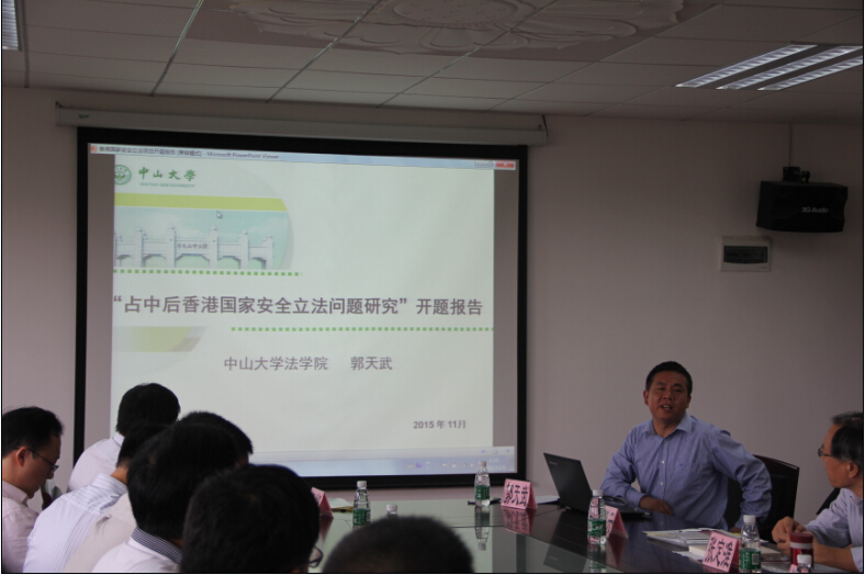 2015年11月 6日,由港澳与内地合作发展协同创新中心、中山大学法学院举办的“香港基本法23条立法研讨会”暨国家社科基金重大招标项目“‘占中’后香港国家安全立法问题研究”开题报告会于中山大学文科楼6楼顺利召开。来自中联办、国务院港澳办港澳研究所、北京大学、上海社会科学院法学研究所、南开大学、暨南大学、广东省社科院、中南财经政法大学、河南大学、华南理工大学、中山大学等十余所高校和科研机构共52名代表参加了本次会议。