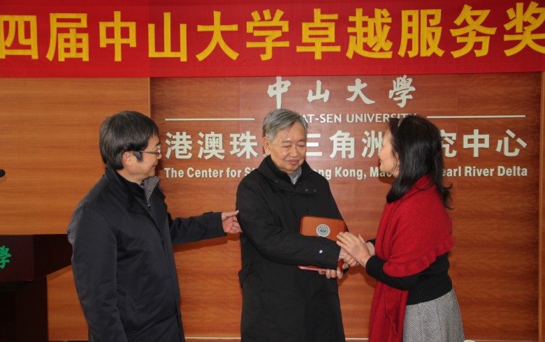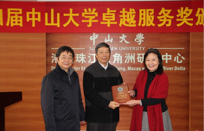 港澳珠三角研究中心于2013年1月10日上午举行雷强教授、郑天祥教授中山大学卓越服务奖颁奖仪式。中心主任陈广汉教授主持会议,中山大学党委副书记李萍教授参加会议,为两位教授颁奖并致贺词。李萍副书记说,我代表学校祝贺两位教授获得卓越服务奖,并感谢两位教授对中大和港澳中心作出的杰出贡献。今天这个特别的日子我们有两点应该记住,其一是港澳研究领域今天的发展,与这些老前辈们当年的理想和远见是分不开的。1980年代初期港澳研究仍是非常冷僻的研究主题,但是老前辈们离开自己所从事的热门专业、在经费缺乏、研究条件不足的情况下投入到港澳研究中,为该领域奠下组织机构、对外联络、研究资料和成果的基础。可以说,没有前辈们的远见卓识、无惧艰难的勇气和无私奉献的精神,便没有中山大学港澳研究特色领域今天的发展。其二,港澳研究所成立晚于中国改革开放仅仅3年,30年来从研究所到研究中心及教育部第一批文科重点研究基地,组织的扩展和人才的凝聚证明港澳研究中心的发展与国家的发展方向历史地吻合;而港澳发展和国家发展需要多学科汇合形成研究合力,这与中心的人才结构特点相符。我们意识到,一定要竭尽全力工作,取得更大的成就,不负前辈努力、时代使命、和中山大学提供的发展平台。雷强教授和郑天祥教授向李萍书记表示感谢,并发表感言说很高兴自己当年投入港澳研究,也很高兴看到今日港澳研究人才济济,我们人老心不老,仍在继续为港澳研究尽力。原港澳研究中心主任许锡挥教授代表老教授对两位教授获奖表示祝贺。