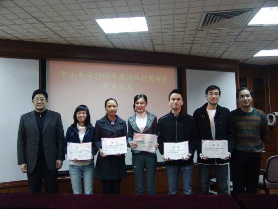 我中心获得“2009年冯汉柱奖学金”的同学有:2008级硕士研究生陈成炉、王洁、黄燕玲、张奕赟、简倩琳等5位同学。袁持平副主任为获奖同学颁发荣誉证书,并合照留念。