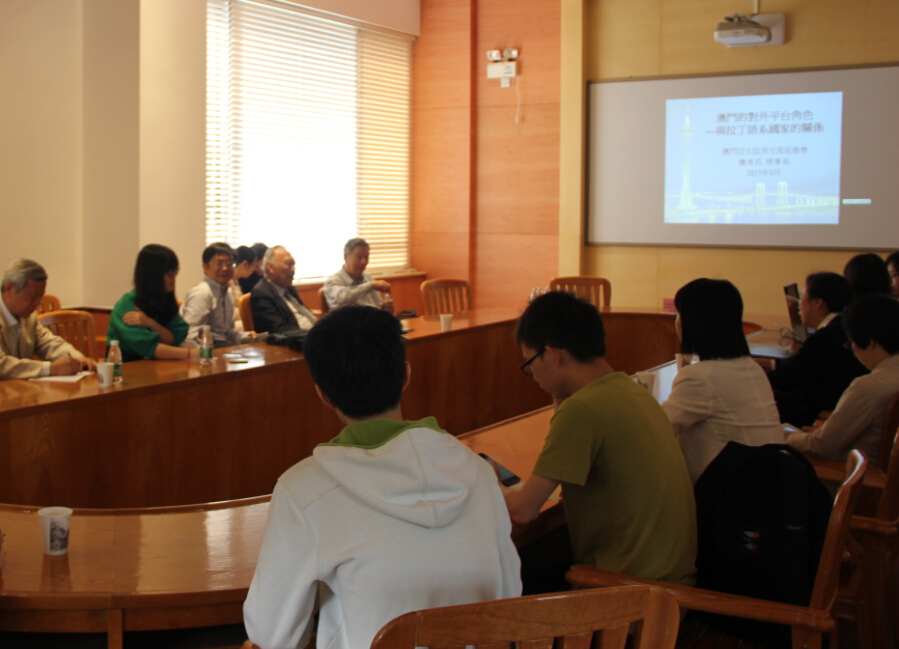 2015年4月22日上午,澳门亚太拉美交流促进会理事长魏美昌先生为我中心师生作了主题为“‘一路一带’与澳门——澳门与拉丁语系国家的对外平台角色”的讲座,港澳珠江三角洲研究中心陈丽君教授主持了讲座,并对魏美昌先生的到来表示了热烈的欢迎。中心陈广汉教授、黎熙元教授、周运源教授、郑天祥教授也出席了此次讲座。