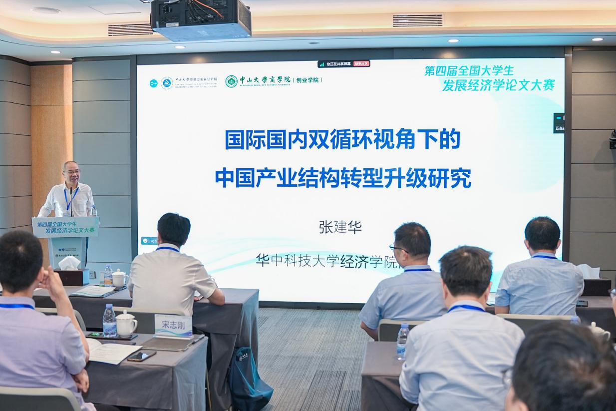 随后,进行了大赛主题演讲,该环节由中山大学商学院(创业学院)院长李广众教授主持。华中科技大学经济学院院长张建华教授作《国际国内双循环视角下的中国产业结构转型升级研究》主题演讲,指出国内、国际双循环的新发展格局与中国产业结构的变迁存在重要联系,认识与理解双循环格局对于中国产业融合与产业分化的影响,对于实现以高质量发展推动新阶段下的中国式现代化意义重大。复旦大学经济学院副院长寇宗来教授作《有限理性与产业发展政策》主题演讲,认为在实现经济快速发展与社会长期稳定的过程中,强化对产业发展政策的研究,有助于形成中国经济学分析范式,需要突破现有完美理性分析范式的贫困,向有限理性分析范式转化。中山大学国家发展研究院院长赵昌文教授作《新工业革命中的若干重大理论问题》主题演讲,认为数字化转型与绿色低碳转型是后发经济体在推进工业化过程中遇到的重要挑战。在新一轮工业革命的背景下,在推进中国式现代化过程中,需抓住机遇,围绕数字化与绿色转型两大新一轮工业革命的标志性代表性领域,从制度环境与精神理念两端发力。