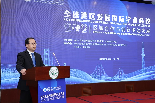 10月23日,“2021全球湾区发展国际学术会议”在中山大学南校园举行。此次会议以“区域合作与创新驱动发展”为主题,由中山大学粤港澳发展研究院主办,岭南大学潘苏通沪港经济政策研究所、澳门大学粤港澳大湾区研究中心、天目新闻和中国知网协办。会议通过现场会议、网络连线、视频录播、线上实时直播等方式进行研讨交流,线上线下共有百余位嘉宾参会。中山大学党委书记,粤港澳发展研究院院长陈春声、国务院港澳事务办公室港澳研究所所长奚俊坚等出席会议。