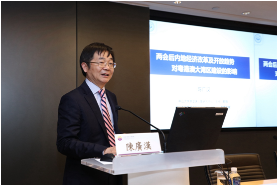 应香港中银集团研究部和香港中资银行业协会的邀请,中山大学粤港澳发展研究院副院长、首席专家,港澳珠三角研究中心主任陈广汉教授于4月23日在香港中银大厦香港为香港中资银行业协会的银行业界做了《两会后内地改革开放趋势对粤港澳大湾区建设的影响》学术报告。