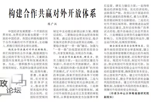 港澳珠江三角洲研究中心主任、中山大学粤港澳发展研究院副院长陈广汉教授被邀请作大会发言,题目为《加强顶层设计,构筑有利于合作共赢对外开放新体系》。